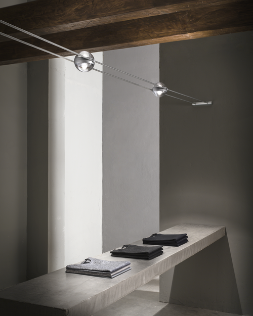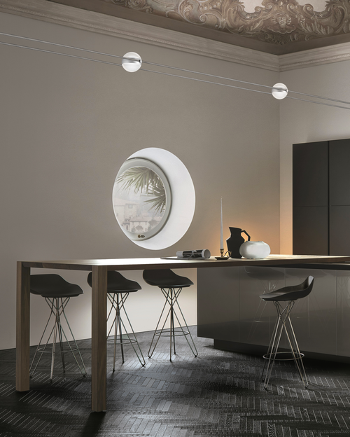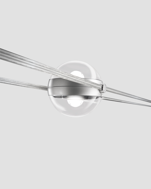 miniTensoApparecchio led, su cavi a 230V a doppia emissione per luce diretta e indiretta. MiniTensoSferico con struttura bianco o argento, è corredato da calotte in metacrilato trasparente con lenti concentranti per luce puntuale oppure da calotte in metacrilato opalescente per luce diffusa. L’elegante forma sferica di soli 14 cm è ideale in piccoli e medi ambienti. Apparecchio munito di TensoClic, connettore brevettato a perforazione d’isolante.