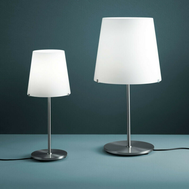 Table lamp with dimmer. Satin white blown glass diffuser. Nickel-plated metal frame.