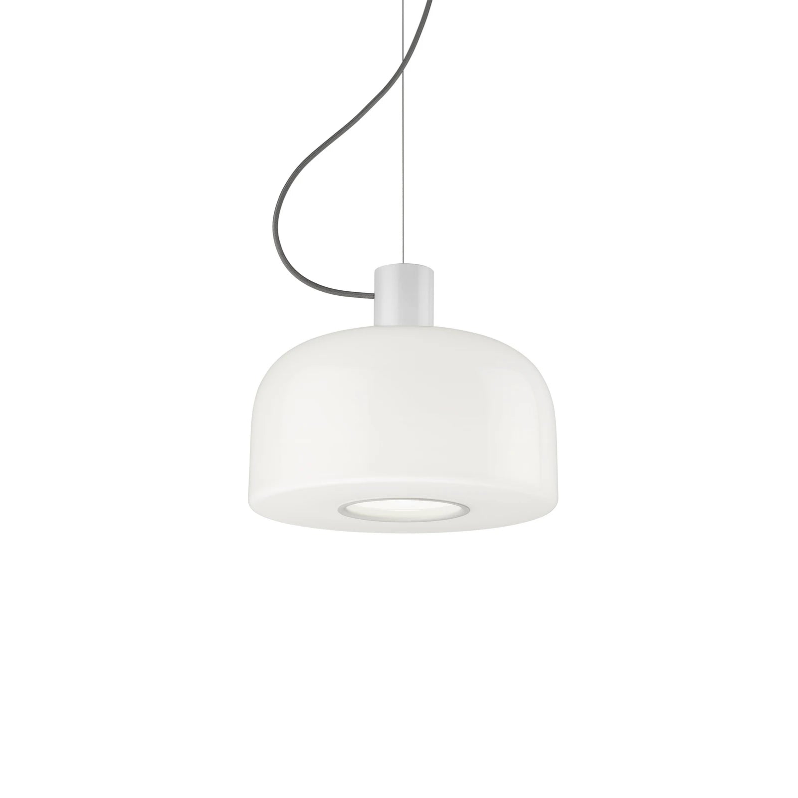 Bellhop Glass Suspension può essere utilizzata sia come luce d'ambiente che come luce da lavoro. Proietta un cono di luce diretto e non abbagliante sulla superficie sottostante. L'apertura nella parte inferiore del diffusore, protetta da un elemento in alluminio, è sagomata per orientare il fascio luminoso verso il basso agevolando la sostituzione della sorgente luminosa e per evitare la diffusione della luce verso gli occhi di chi è seduto attorno al tavolo. Alli'nterno della Bellhop Glass sospesa si genera così un cono di luce che si diffonde in modo uniforme nell'ambiente, illuminando con precisione la superficie sottostante, come una torcia. L'anello in alluminio colorato che incornicia l'apertura inferiore ne sottolinea l'effetto visivo.