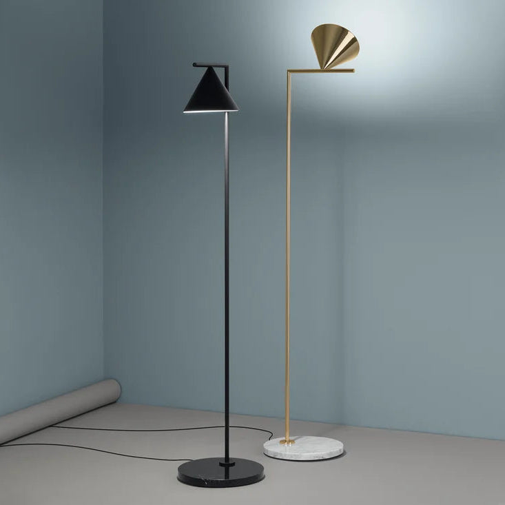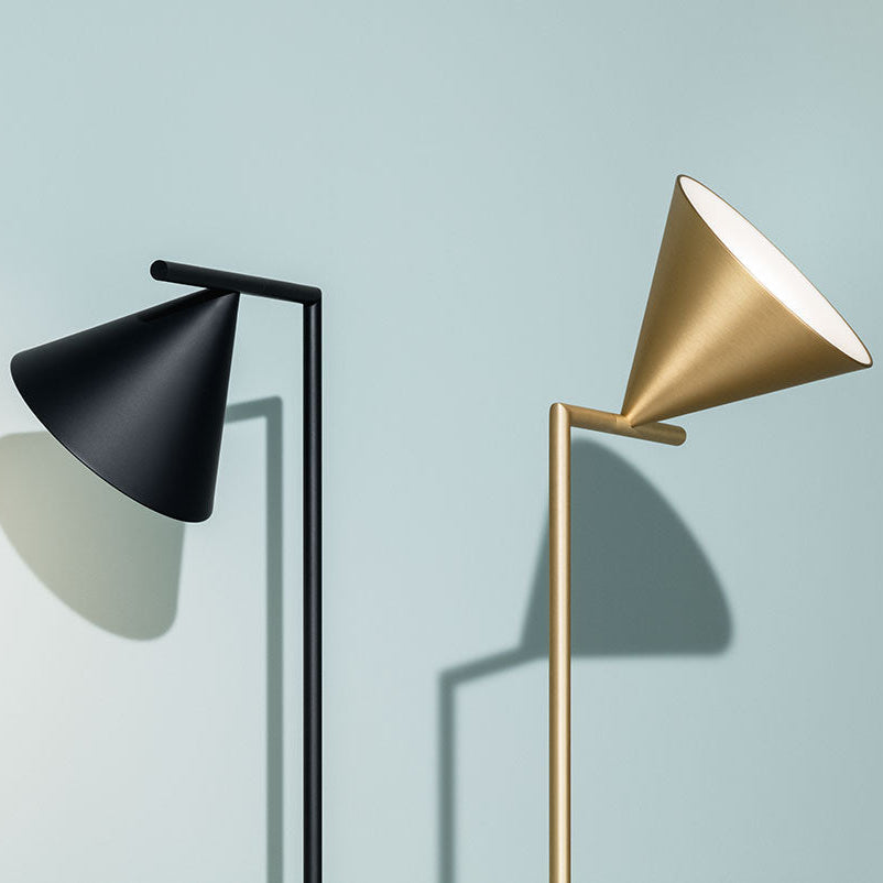 Apparecchio di illuminazione da terra a luce diretta direzionabile. Asta e cono in acciaio verniciato o ottone spazzolato. Diffusore in policarbonato opalino fotoinciso stampato ad iniezione. Cavo elettrico lunghezza utile 260 cm, con interruttore dimmer a pedale che garantisce le funzioni ON/OFF e regolazione del flusso luminoso 10-100%. Power supply su spina con plug intercambiabili.