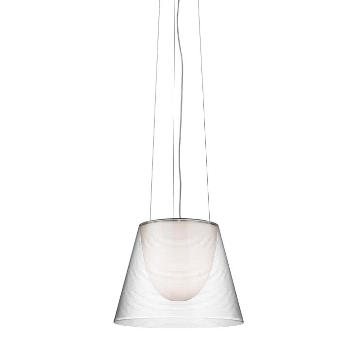 Lampada a sospensione a luce diffusa. Diffusore interno in PC (policarbonato) con finitura bianco opaco. I diffusori esterni sono disponibili nelle versioni: trasparente o fumè realizzati in PMMA (polimetilmetacrilato), e metallizzato grigio o bronzo sulla superficie interna utilizzando un processo di alluminatura sottovuoto. Tre cavi di sospensione in acciaio inossidabile, lunghezza utile mm 4000. Rosone di colore bianco