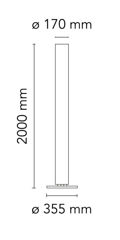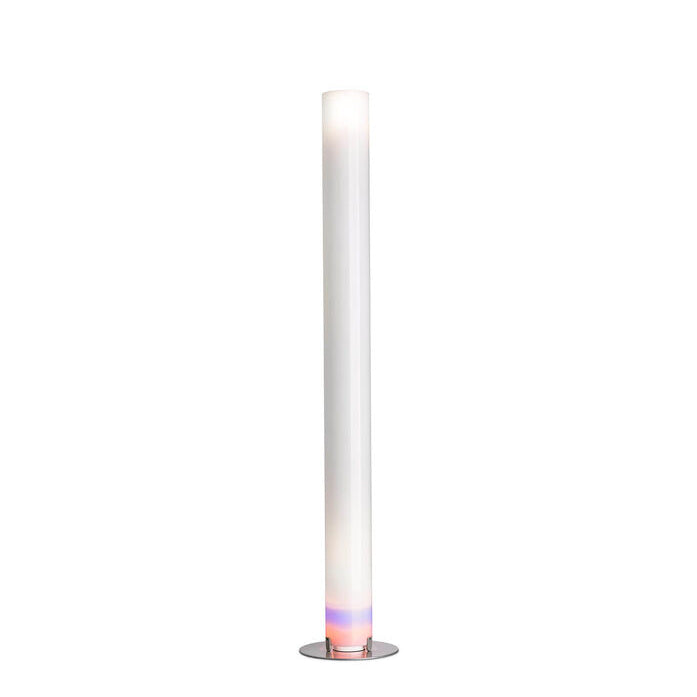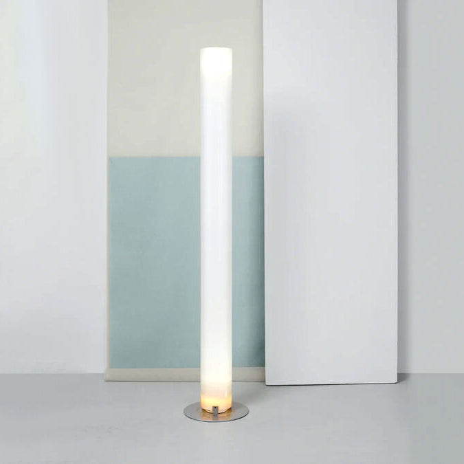 Lampada da terra a luce indiretta e diffusa. Base di acciaio verniciato di colore argento a polvere. Diffusore cilindrico, estruso in polimetilmetacrilato (PMMA) opalino. Le funzioni ON/OFF delle due sorgenti luminose poste alle due estremità del diffusore dell'apparecchio, avvengono mediante doppio interruttore a pedale montato sul cavo elettrico di alimentazione
