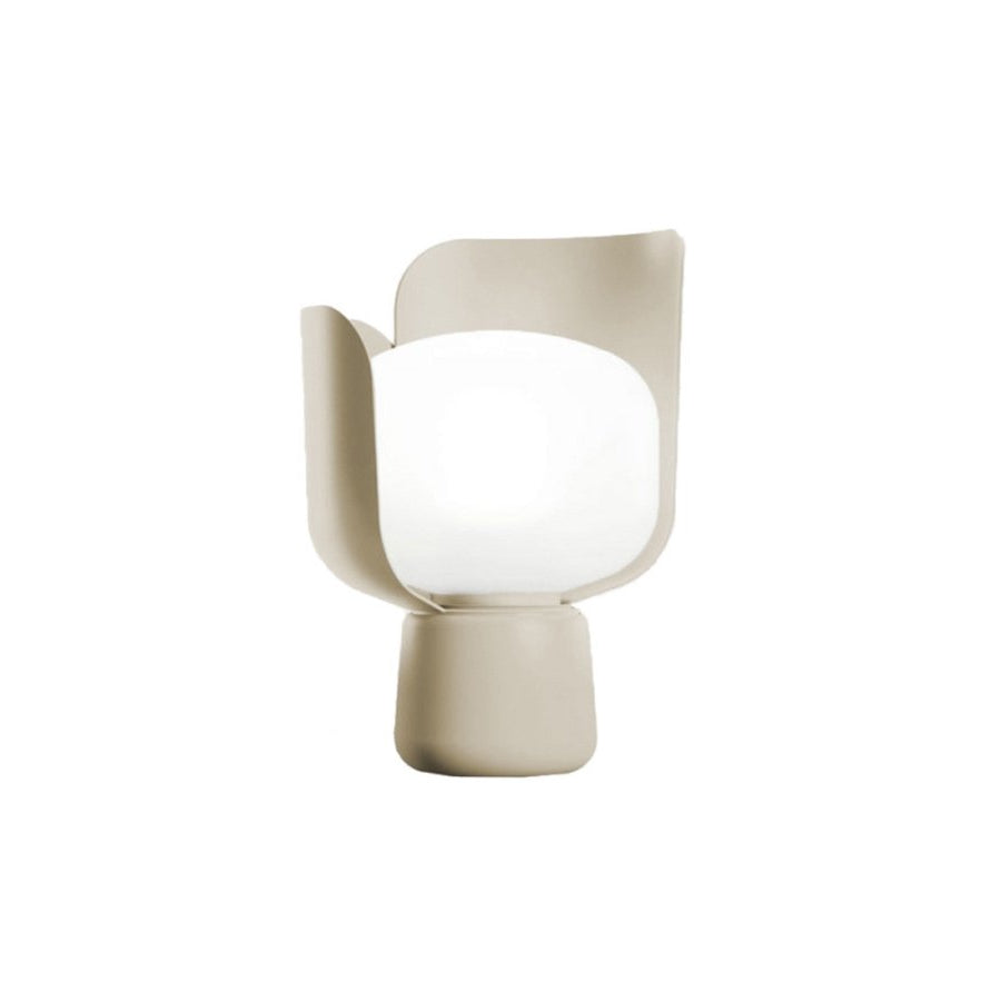 Lampada da tavolo a luce diffusa regolabile tramite la rotazione dei petali sulla base. Montatura in alluminio verniciato, petali in policarbonato riciclato. Diffusore in polietilene opalino bianco latte. Cavo di alimentazione, interruttore e spina trasparenti. Spina europea due poli.