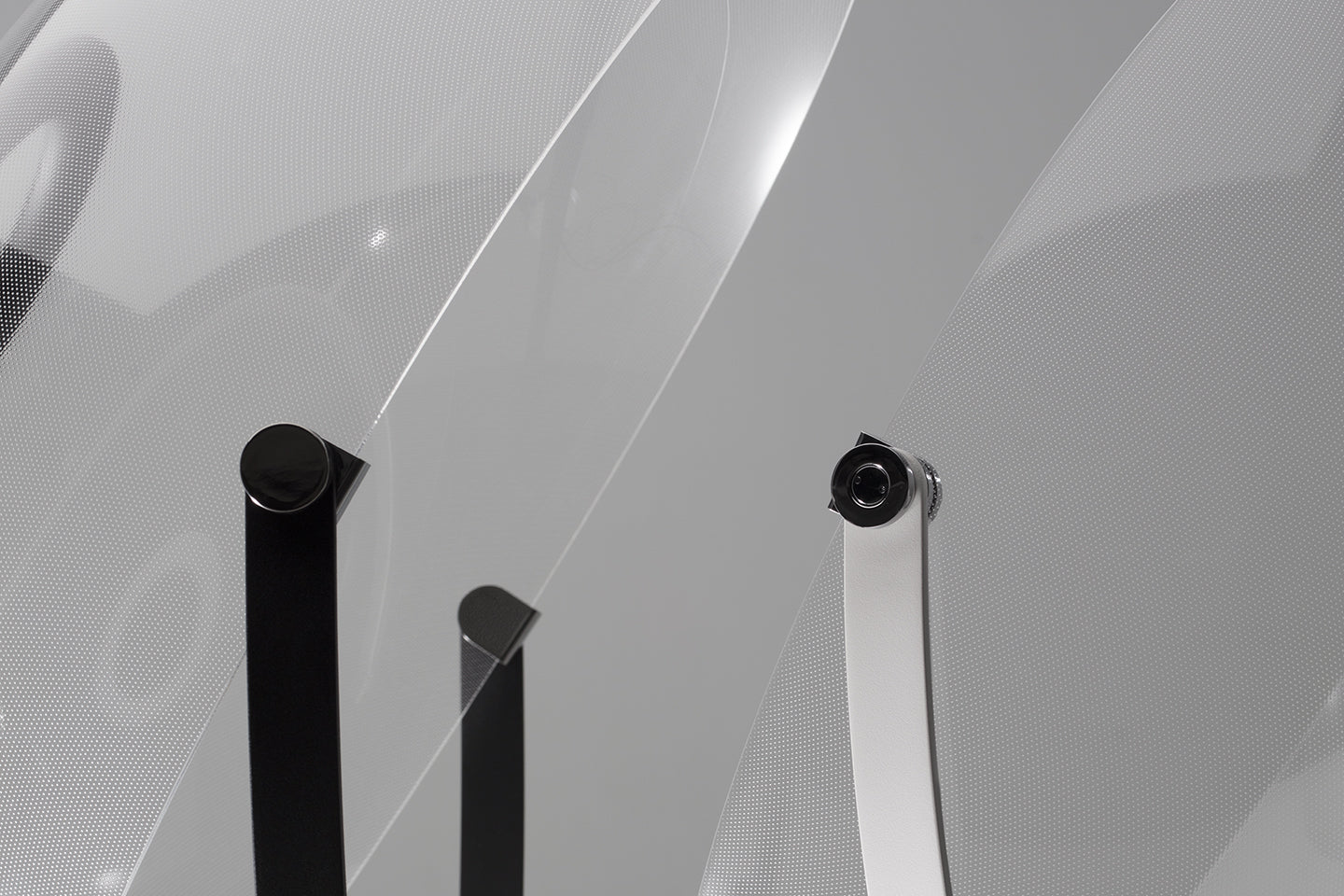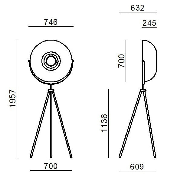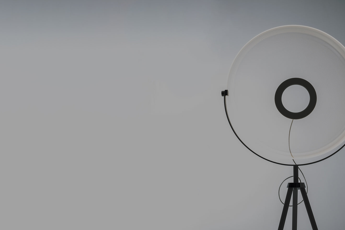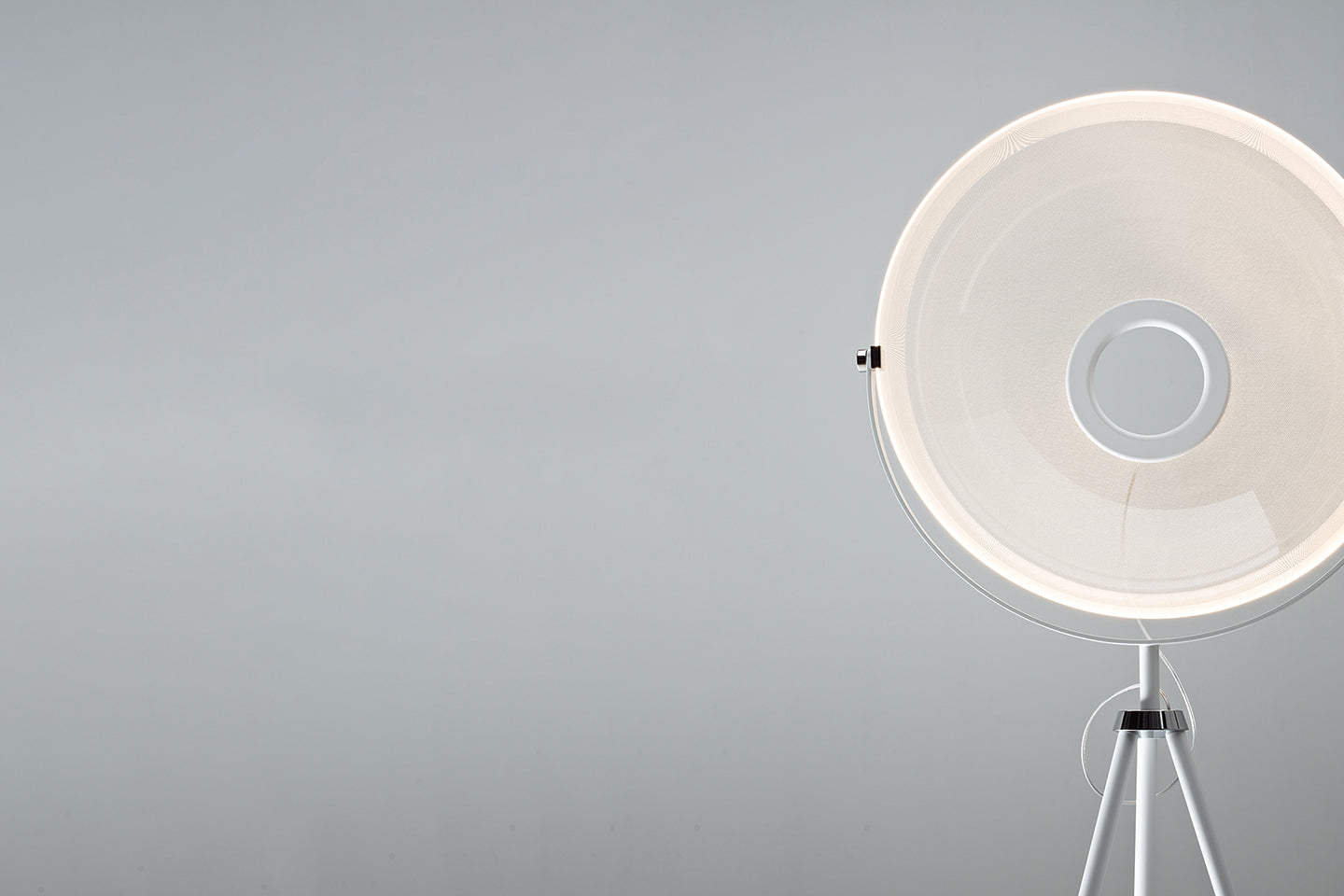Diffusore in PMMA termosoffiato trasparente. Anello centrale in alluminio. Struttura a treppiede in metallo. Finiture: bianco oppure nero.