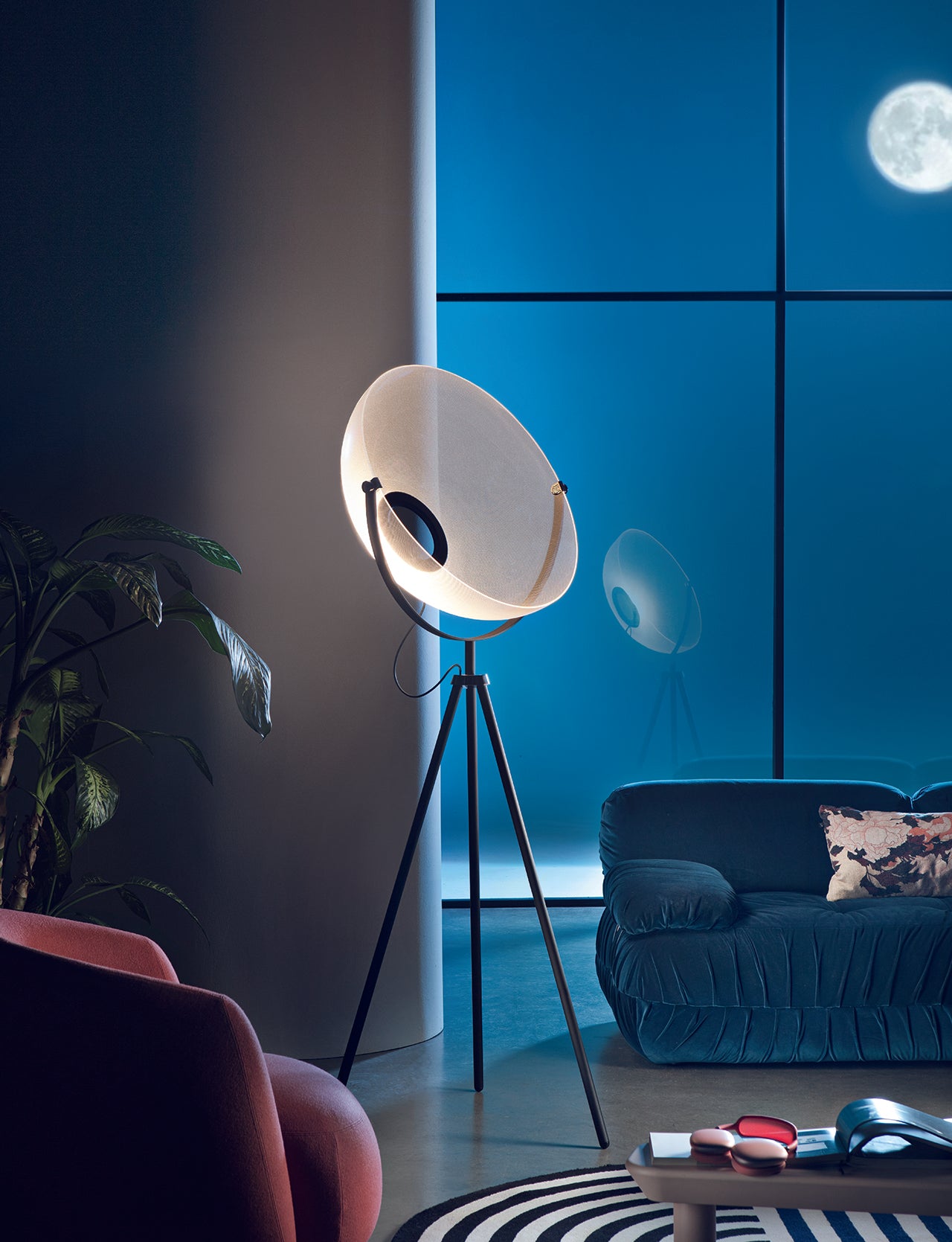 Demí Moon da spenta è un’ampia cupola trasparente. Grazie alla tecnologia Opti-Light™, quando viene accesa, il bordo e le migliaia di microincisioni al laser della superficie diffondono un’illuminazione morbida e omogenea. La cupola è agganciata ad una struttura di sostegno a treppiede. Un pratico sistema di sblocco permette di orientare la cupola.